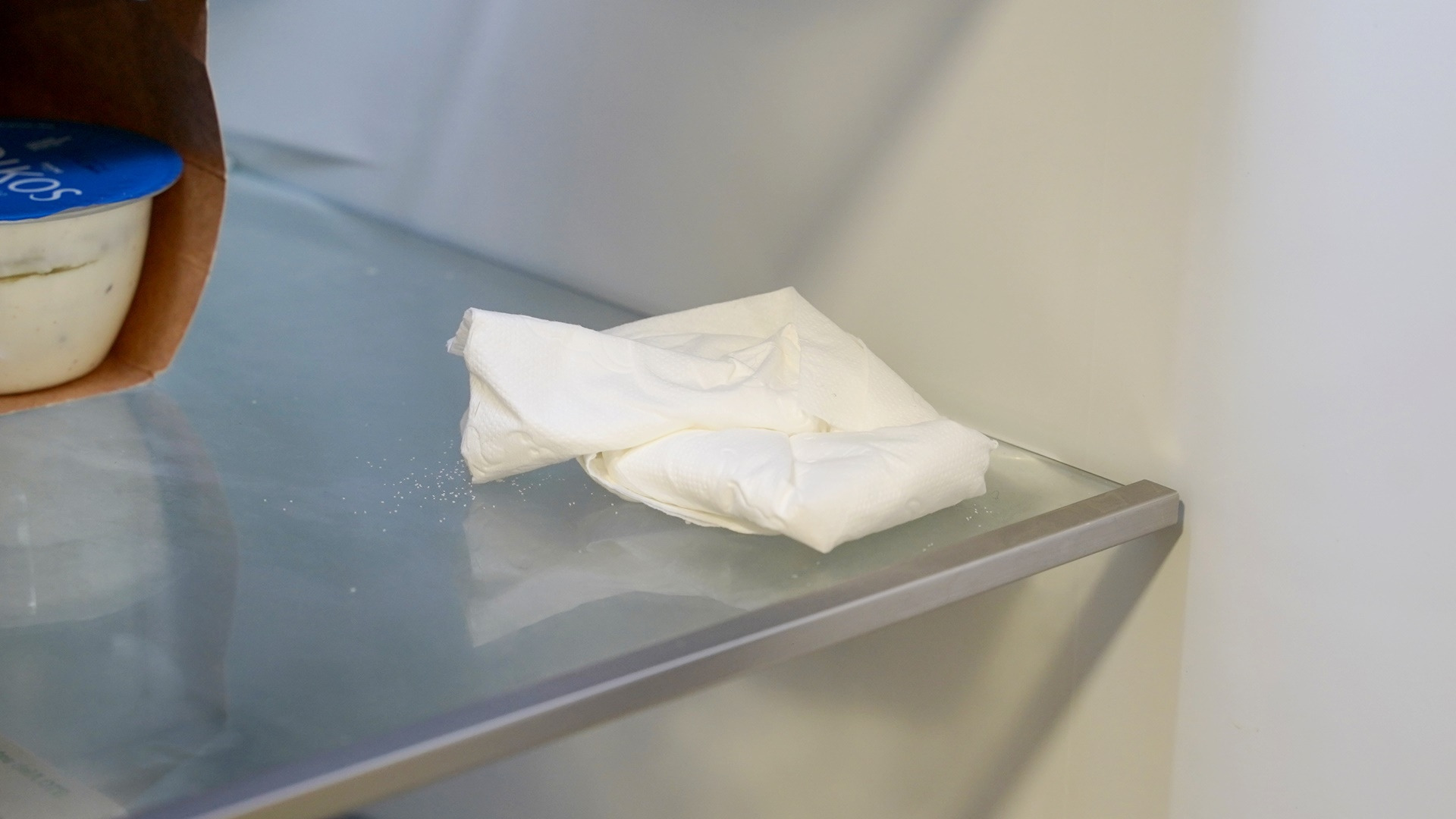 이렇게 접은 휴지는 냉장고 한편에 잘 두세요. 그러면 탈취 성능이 좋은 베이킹소다가 냉장고 속 냄새를 쏙쏙 흡수하게 된답니다.
