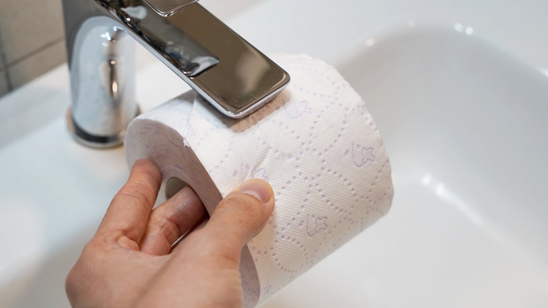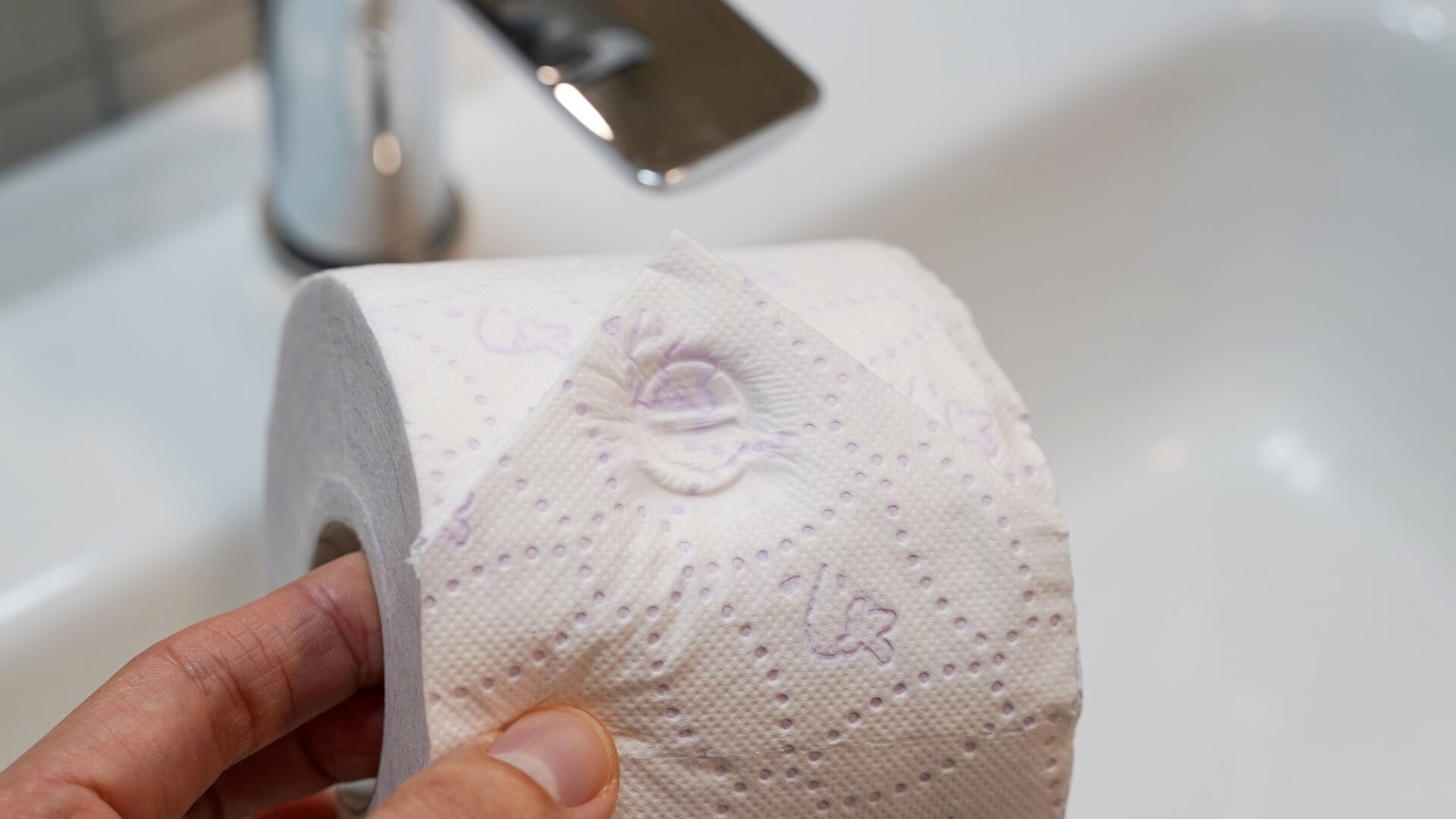 이제 잘 접어 놓은 휴지를 수도꼭지에 2초 정도 꾹 눌러 주세요. 그러면 남아 있던 물기와 함께 자국이 생기게 되는데요.