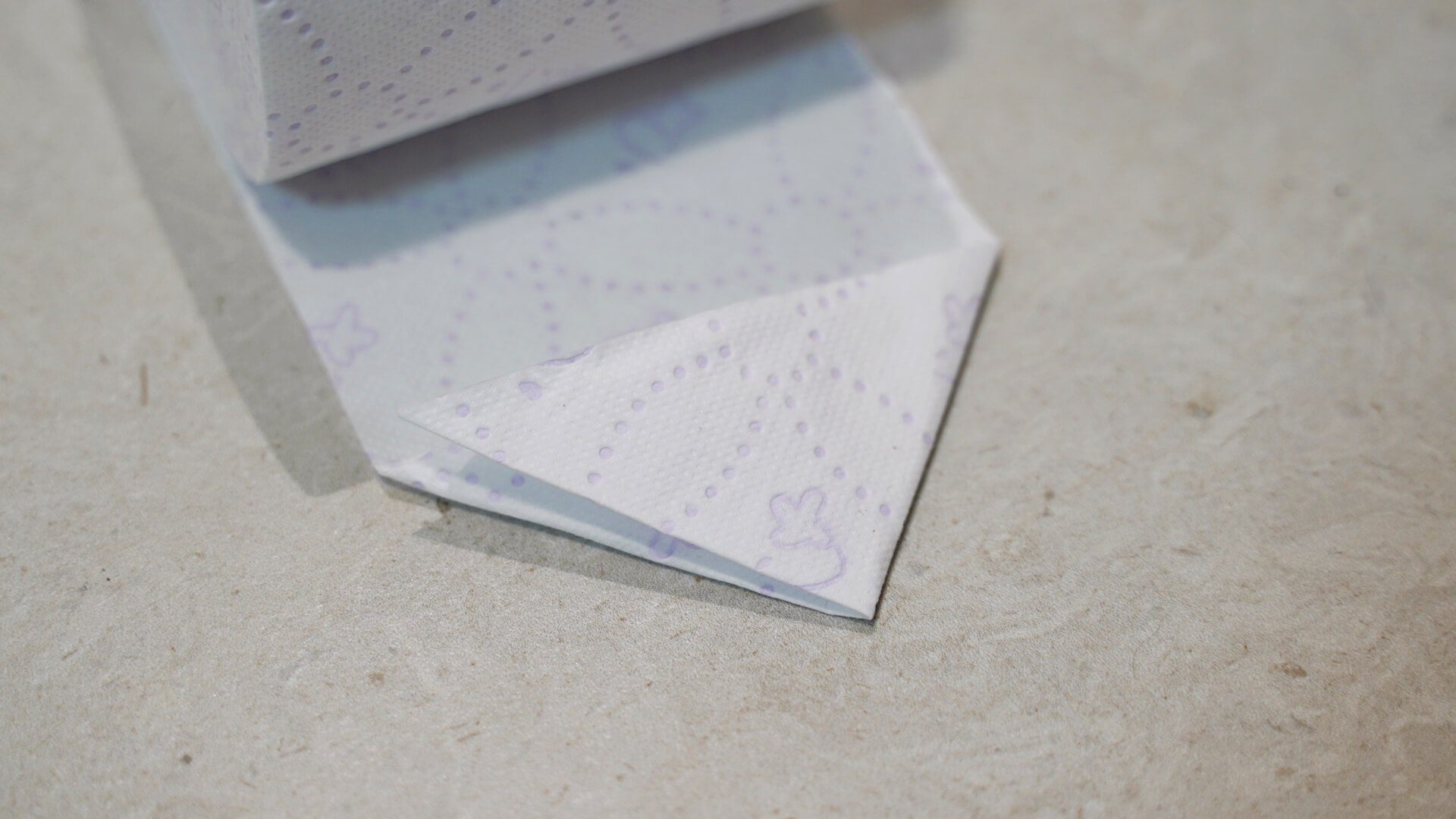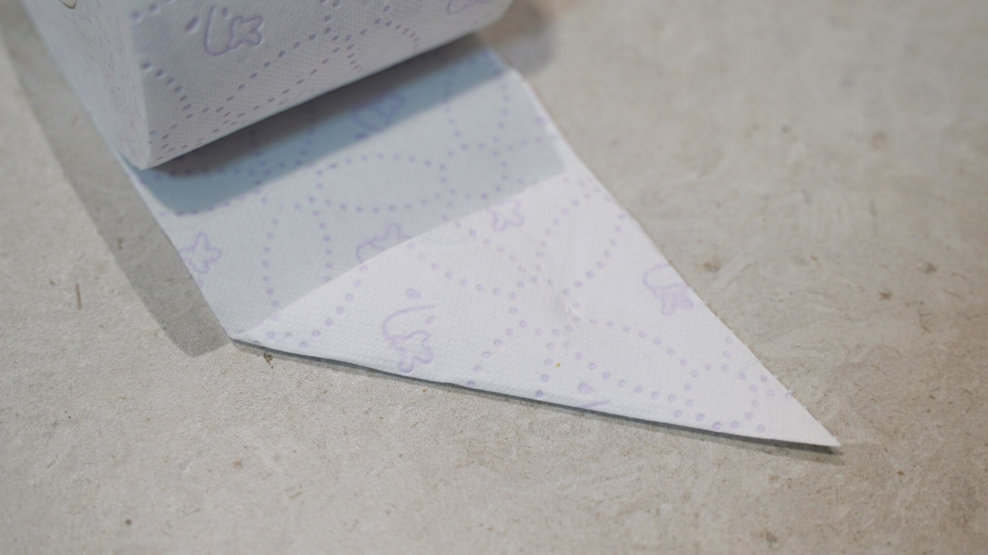 먼저 휴지 끝 부분을 접어 줍니다. 대각선으로 접은 후 다시 반대쪽을 대각선으로 접어 세모 모양으로 만들어 주세요.