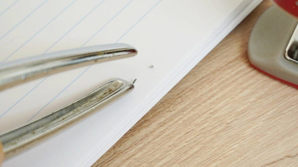 그러면 스테이플러 심이 구부러지지 않고 잘 박혀 있는 것을 보실 수 있는데요. 휴지가 지지대 역할을 해주어 더욱 힘이 가해지기 때문에 두꺼운 종이도 문제없이 사용 가능해요.
